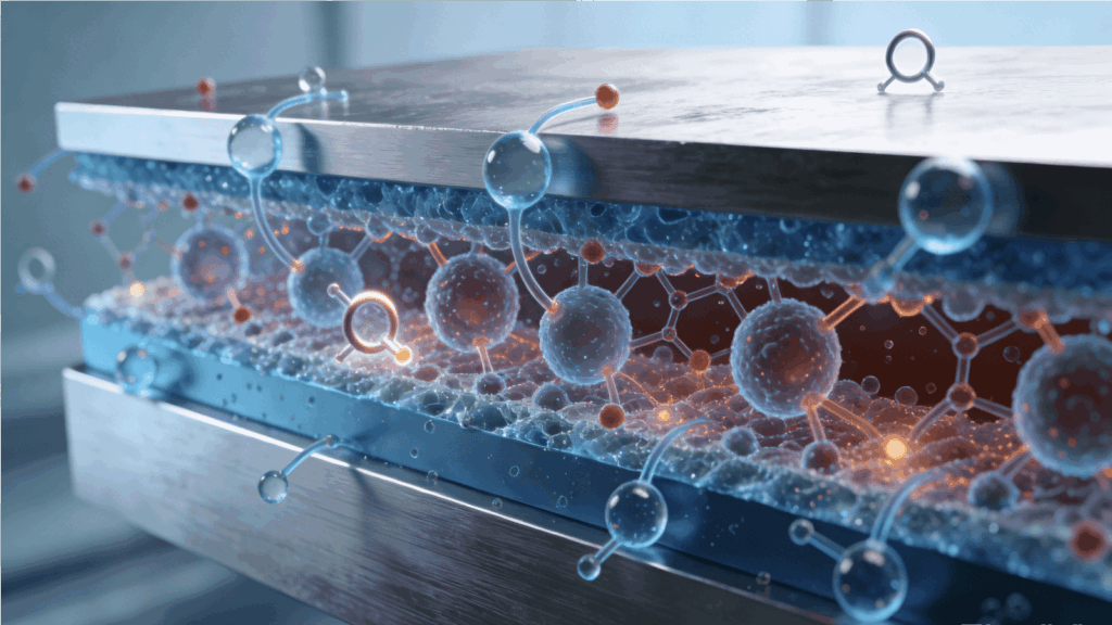Stainless steel contains at least about 10.5% chromium. In the presence of oxygen from air or water, chromium forms a very thin, stable oxide layer on the surface known as the passive film. This film separates the underlying metal from the environment and can self-heal if lightly scratched, as long as oxygen is available.
