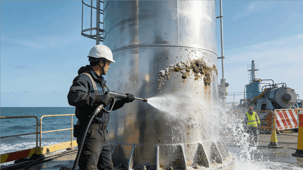 In immersed systems such as seawater filtration, cooling, and intake structures, cleaning biofouling and deposits is essential. Under-deposit corrosion beneath marine growth or sediment can progress unnoticed if inspection and cleaning are neglected.