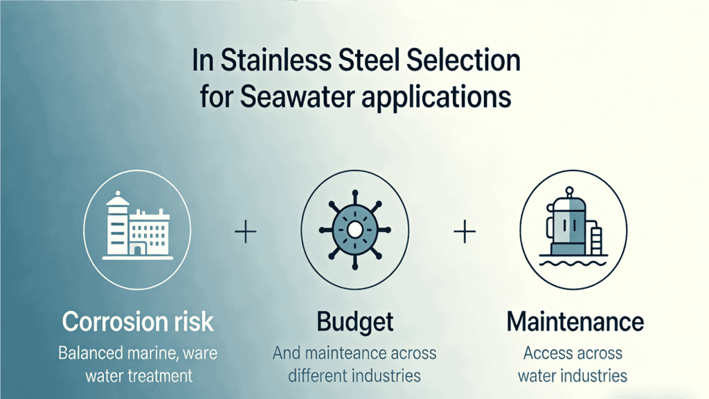 Each sector balances corrosion risk, budget, and maintenance access differently, which is why no single stainless grade fits every seawater application.