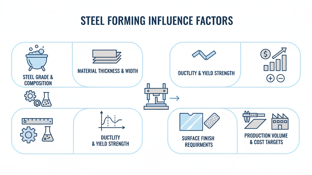 Before selecting a steel forming process, manufacturers must consider several material and design factors: