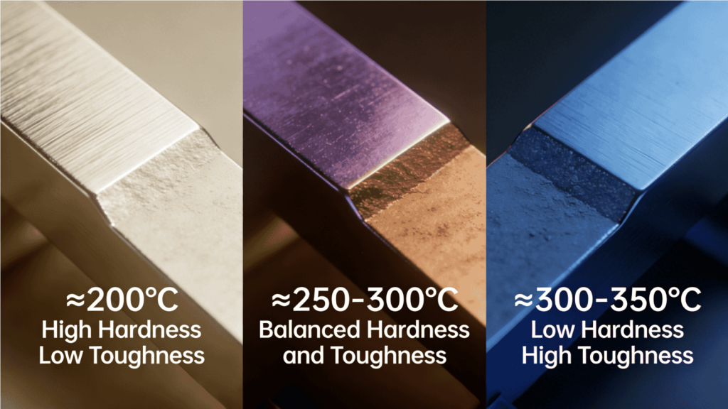 • Blue (≈300–350°C) – lower hardness, higher toughness