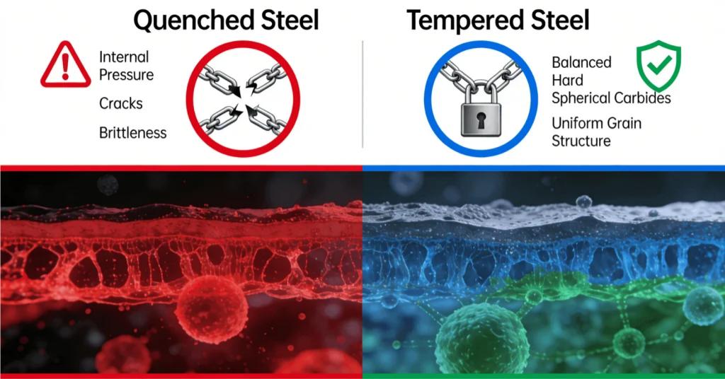 When steel is hardened by rapid cooling, its internal structure becomes very hard but unstable. Without tempering, hardened steel can crack, chip, or fail under stress.